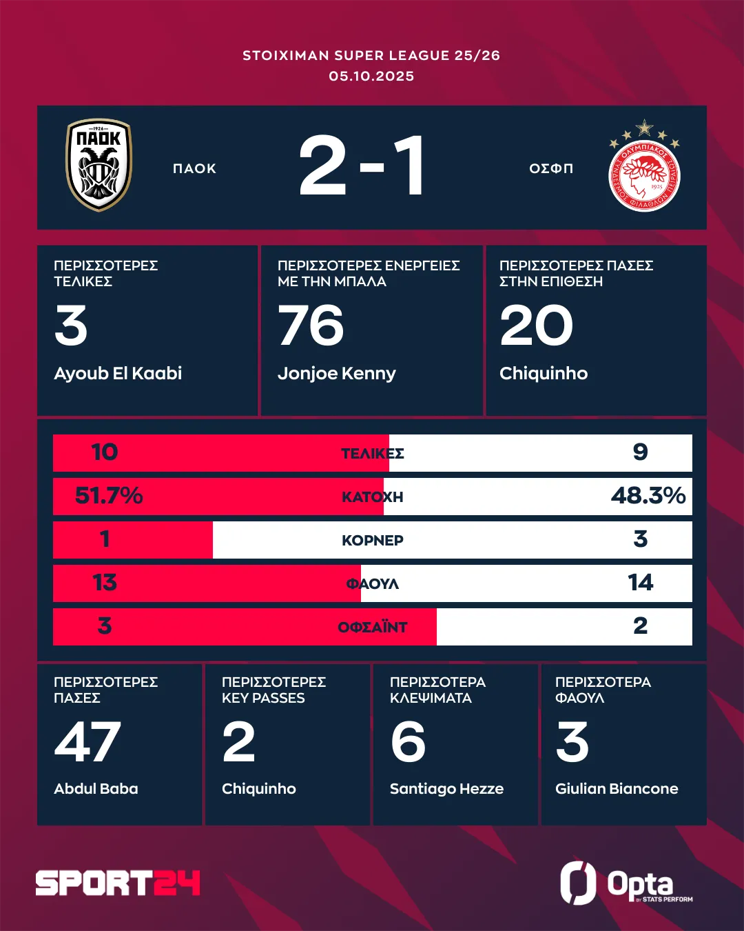 - ΠΑΟΚ: Παβλένκα (46′ Τσιφτσής), Κένι, Κεντζιόρα, Λόβρεν, Μπάμπα, Μεϊτέ, Καμαρά (54′ Οζντόεβ), Κωνσταντέλιας (88′ Ιβανούσετς), Ζίβκοβιτς, Τάισον (64′ Ντεσπόντοβ), Γιακουμάκης.