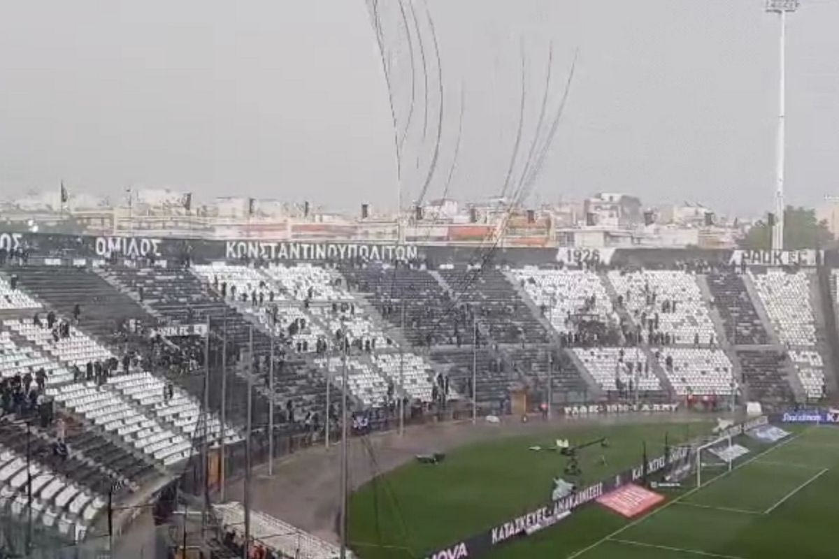 Καταιγίδα ξέσπασε στην Τούμπα περίπου μιάμιση ώρα πριν από την έναρξη του ντέρμπι ανάμεσα στον ΠΑΟΚ και τον Ολυμπιακό για τα playoffs της Stoiximan Super League.