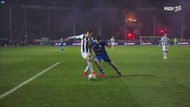 Ο διεθνής εξτρέμ μπήκε στην περιοχή από τα δεξιά, προσπάθησε να περάσει τον Τσιμίκα και στην διεκδίκηση της μπάλας βρέθηκε στο έδαφος ζητώντας πέναλτι για σπρώξιμο του διεθνή μπακ του Ολυμπιακού.