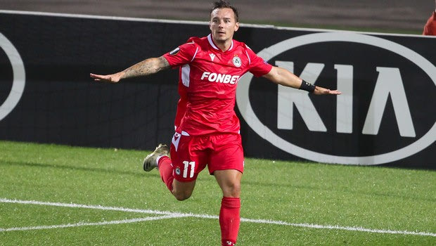 Ο Ερίκ Μποτεάκ πανηγυρίζει το γκολ του με τη φανέλα της Ομόνοιας κόντρα στον ΠΑΟΚ για το Europa League