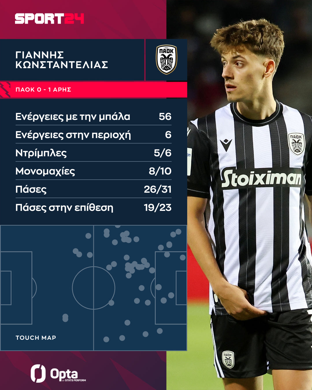 Ο Γιάννης Κωνσταντέλιας τα έκανε όλα στο παιχνίδι με τον Άρη εκτός από το να πετύχει κάποιο γκολ κι ήταν, ιδιαίτερα στο πρώτο ημίχρονο, μέσα σχεδόν σε κάθε φάση που δημιούργησε η ομάδα του.