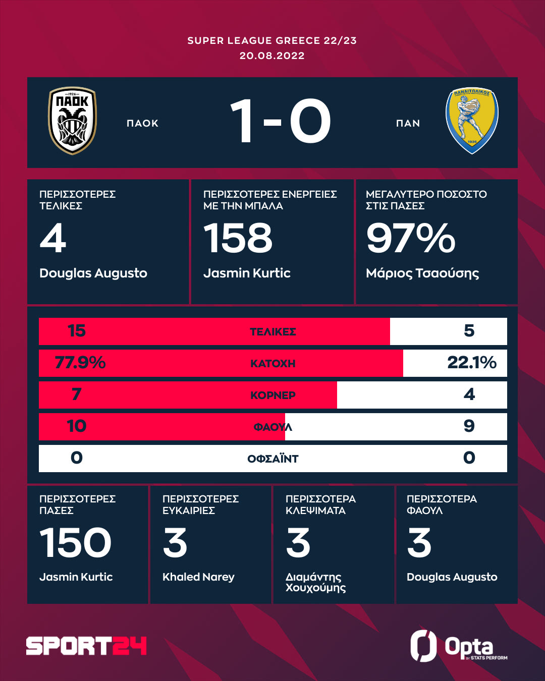Ο δικέφαλος είχε τους Κούρτιτς και Ντάντας σε μεγάλη μέρα καθώς ο Σλοβένος είχε 158 ενέργειες με τη μπάλα στα πόδια ενώ και ο δεύτερος μέχρι να αποχωρήσει από την αναμέτρηση ήταν μεταξύ των κορυφαίων του ΠΑΟΚ σε ένα ματς που ολοκληρώθηκε με την ομάδα της Θεσσαλονίκης να φτάνει στη νίκη με το παρθενικό γκολ του Μπράντον Τόμας στο πρωτάθλημα.