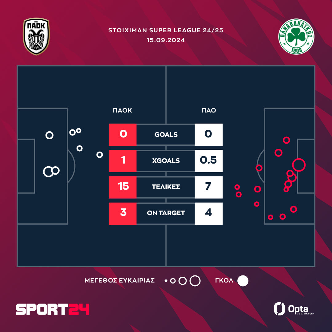 Στο πρώτο μέρος ο ΠΑΟΚ ήταν ανώτερος είχε την κατοχή και περισσότερες ευκαιρίες, αλλά ο Ντραγκόβσκι επενέβη όπου χρειάστηκε. Ο Παναθηναϊκός είχε μια μεγάλη ευκαιρία για να σκοράρει στο 45′, αλλά ο Πελίστρι είχε άσχημο τελείωμα μετά την υπέροχη ατομική ενέργεια του Ιωαννίδη.