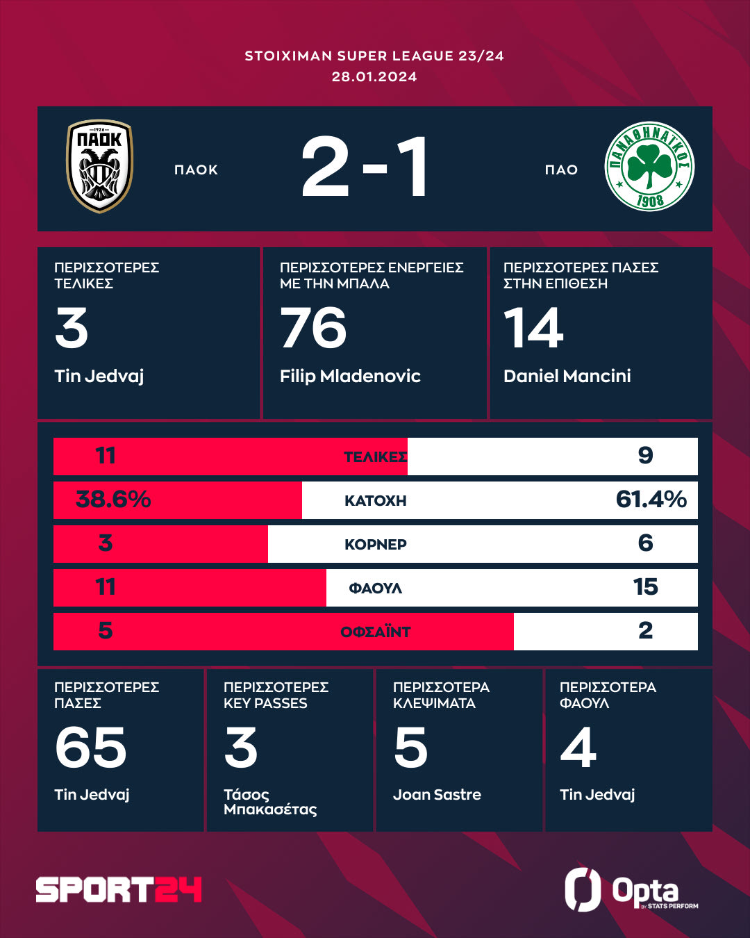Ο Παναθηναϊκός θα μπορούσε να φέρει το ματς στα ίσια στο 71′ της αναμέτρησης όταν ο Κώτσιρας έκανε ωραία ενέργεια από τα δεξιά, γύρισε τη μπάλα προς τον Μπακασέτα που έκανε κίνηση φορ, έκανε το πλασέ με τον Κοτάρσκι να διώχνει σε κόρνερ.