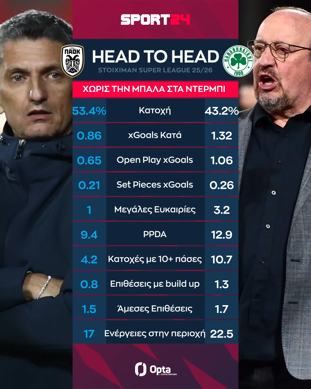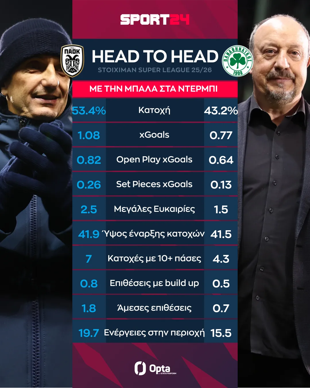 Το SPORT24 βάζει σε ακτίνες τα πεπραγμένα των δύο ομάδων με βάση τα δεδομένα της Opta Stats/Perform στα ντέρμπι (με τις ομάδες των playoffs 1-4) στην κανονική διάρκεια του πρωταθλήματος.