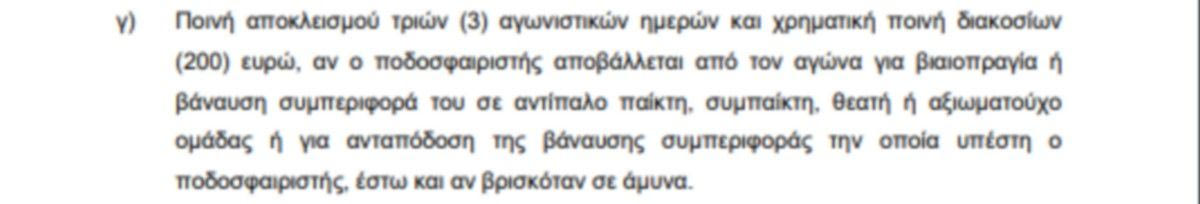 Συγκεκριμένα, σύμφωνα με το εν λόγω άρθρο επιβάλλεται “Ποινή αποκλεισμού τριών (3) αγωνιστικών ημερών και χρηματική ποινή διακοσίων (200) ευρώ, αν ο ποδοσφαιριστής αποβάλλεται από τον αγώνα για βιαιοπραγία ή βάναυση συμπεριφορά του σε αντίπαλο παίκτη, συμπαίκτη, θεατή ή αξιωματούχο ομάδας ή για ανταπόδοση της βάναυσης συμπεριφοράς την οποία υπέστη ο ποδοσφαιριστής, έστω και αν βρισκόταν σε άμυνα”.