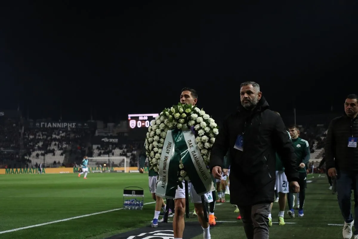 Πριν από τη σέντρα στην Τούμπα οι παίκτες του Παναθηναϊκού κατέθεσαν στεφάνι και λευκά τριαντάφυλλα στη Θύρα 4 στη μνήμη των αδικοχαμένων φίλων του ΠΑΟΚ.