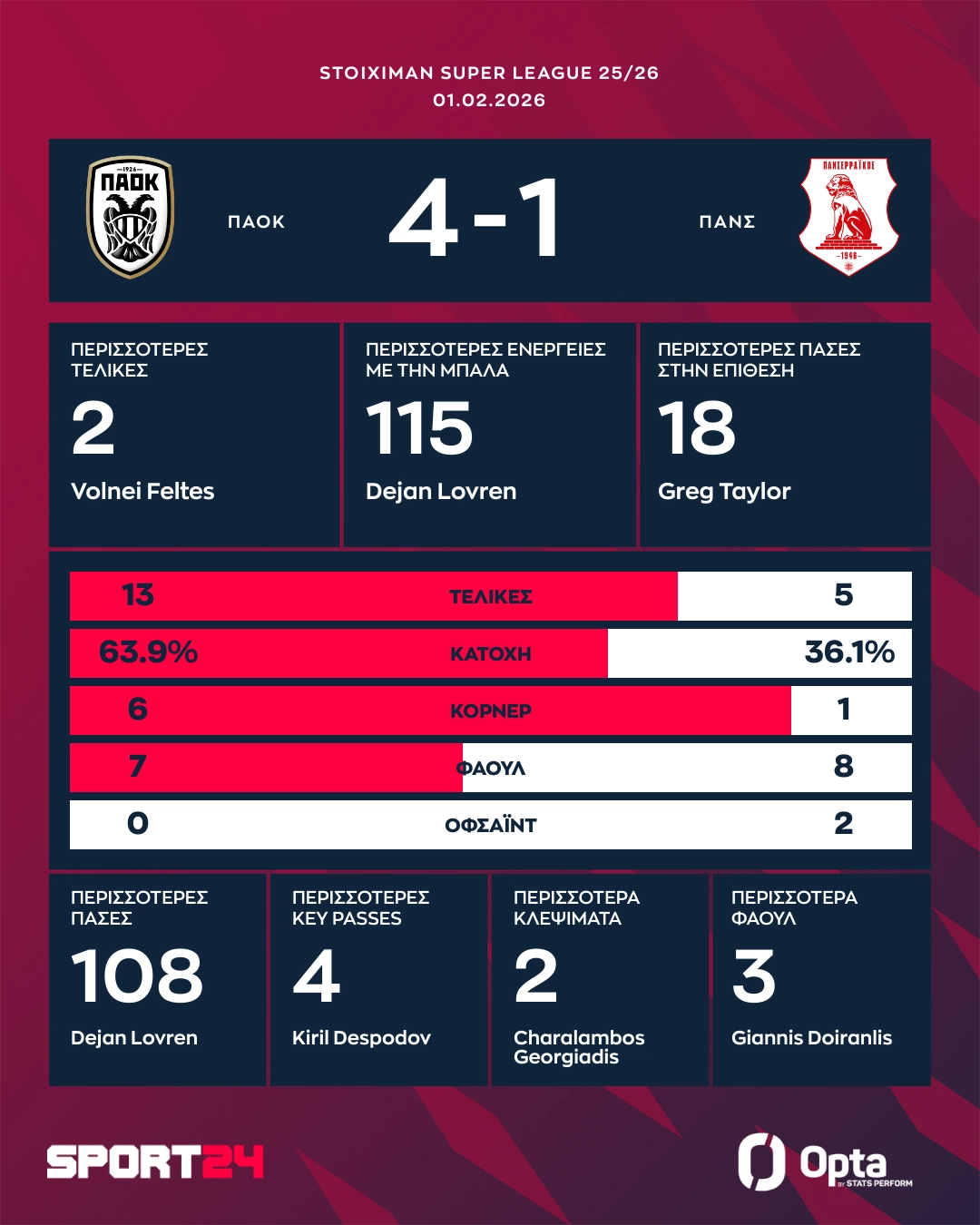 Ο ΠΑΟΚ δεν δυσκολεύτηκε απέναντι στον Πανσερραϊκό, τον οποίο νίκησε 4-1 στην Τούμπα σε ένα παιχνίδι φόρο τιμής στους επτά αδικοχαμένους οπαδούς του Δικεφάλου στο τραγικό τροχαίο στη Ρουμανία. Οι Γερεμέγεφ, Πέλκας και Ντεσπόντοβ είχαν γκολ και ασίστ.