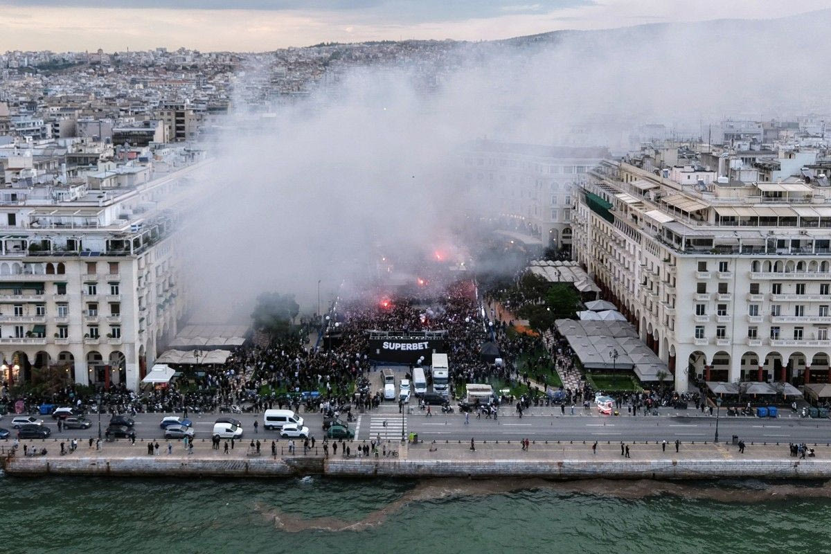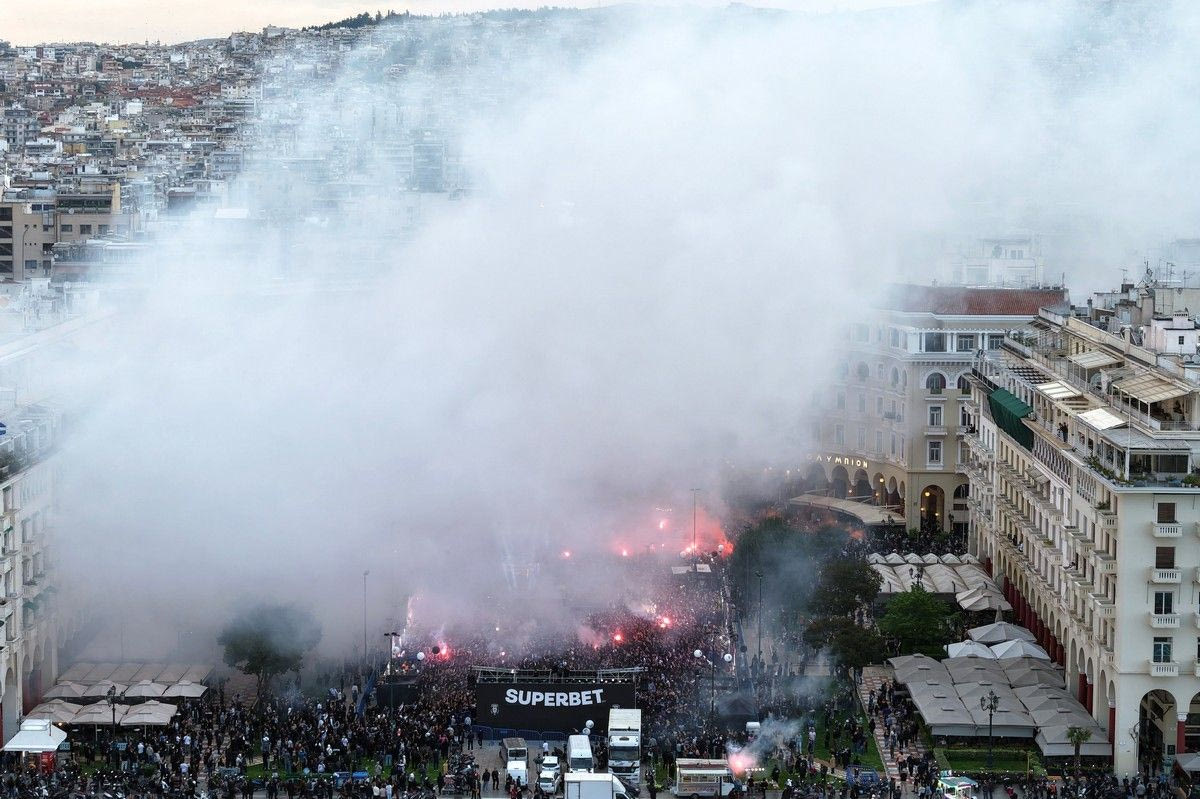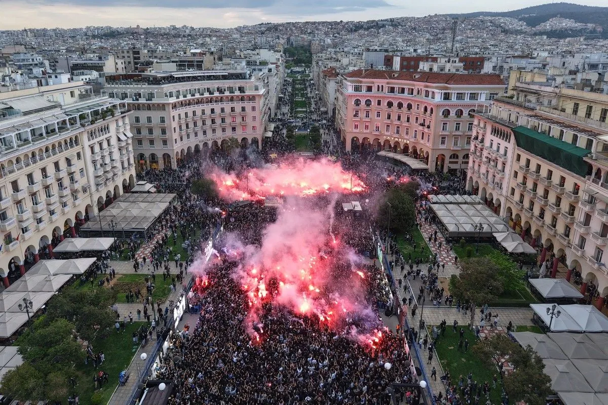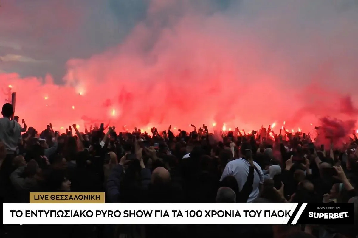 Στις 19:26 η Πλατεία Αριστοτέλους πήρε “φωτιά”, με τους οπαδούς του ΠΑΟΚ να δημιουργούν φαντασμαγορικό pyro show για τα 100 χρόνια του Δικεφάλου.