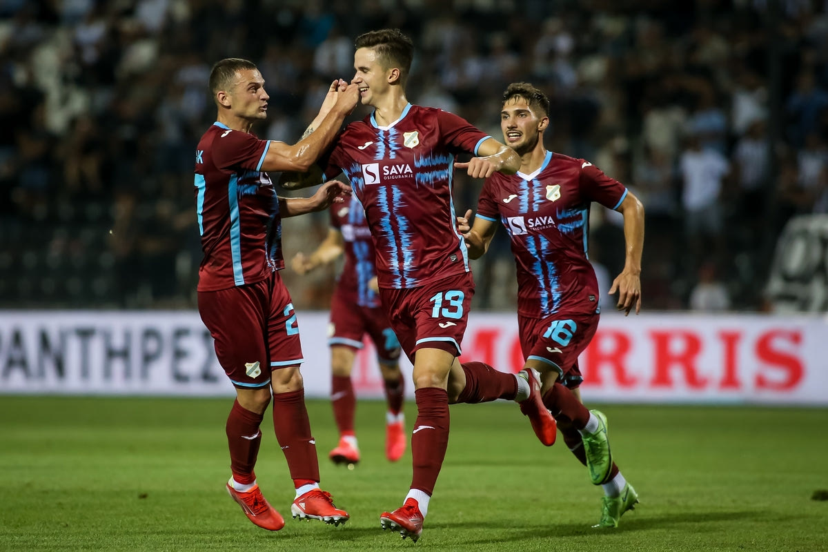 Οι παίκτες της Ριέκα πανηγυρίζουν γκολ κόντρα στον ΠΑΟΚ για τα play offs του Europa Conference League
