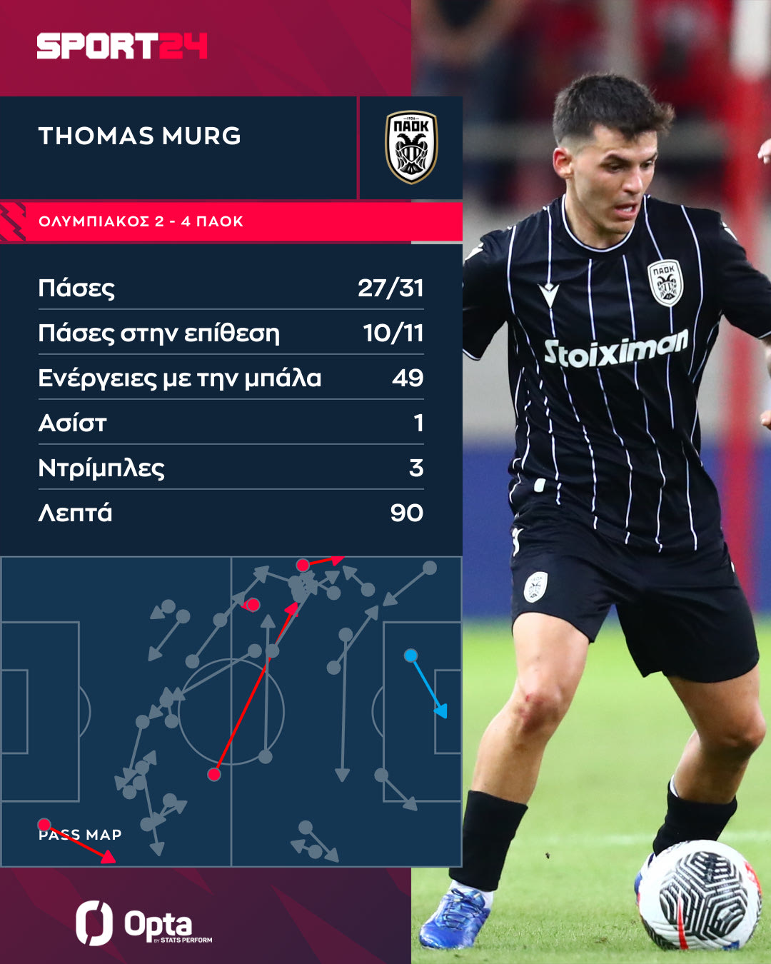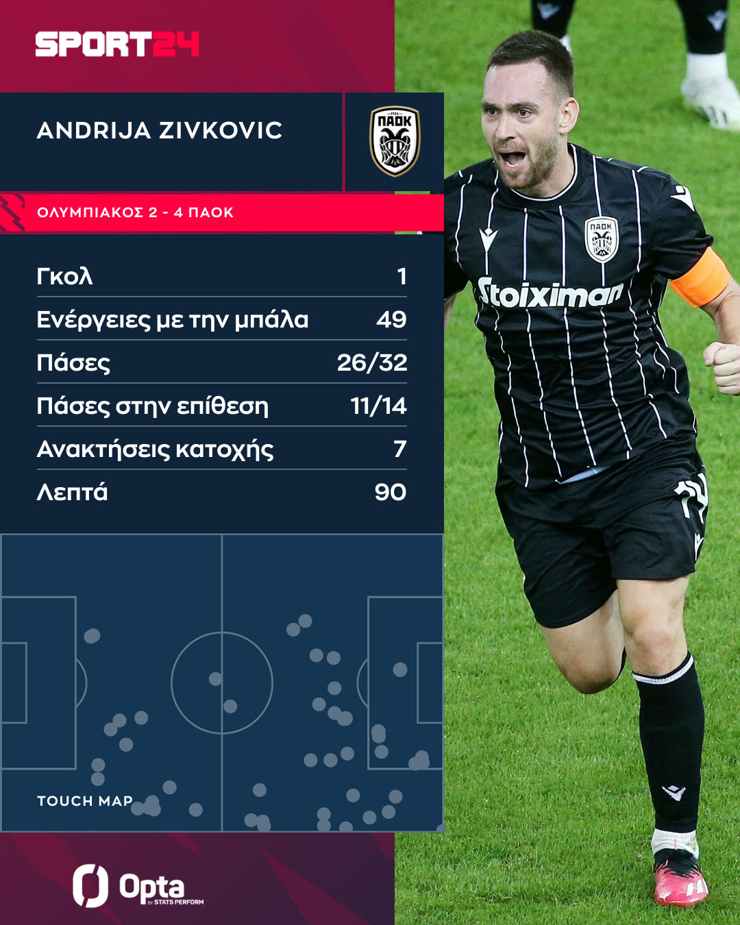 Βγήκε από το ματς στη συμπλήρωση των 90′ με 49 ενέργειες με την μπάλα, επτά (!) ανακτήσεις κατοχής και φυσικά το γκολ που τα ξεκίνησε όλα, με τη βοήθεια και του Πασχαλάκη.