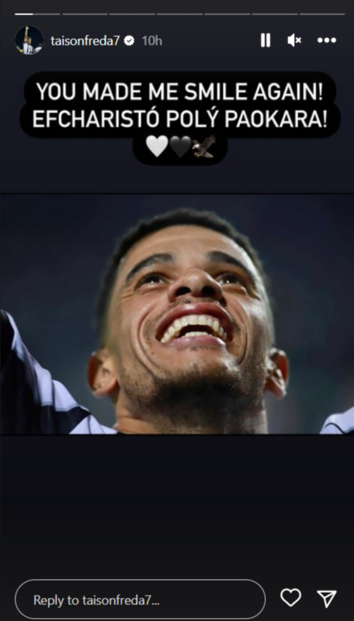 Η ευχαριστήρια ανάρτηση του Τάισον στον ΠΑΟΚ μετά τη νίκη του δικεφάλου επί του Βόλου με 3-0. “Με κάνατε να χαμογελάσω ξανά! Ευχαριστώ πολύ ΠΑΟΚΑΡΑ“.