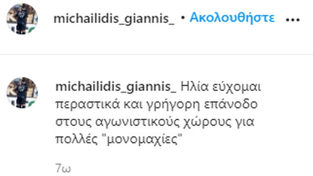 “Ηλία εύχομαι περαστικά και γρήγορη επάνοδο στους αγωνιστικούς χώρους για πολλές “μονομαχίες””, ήταν το περιεχόμενο της ανάρτησης του αμυντικού από τα Γιαννιτσά.