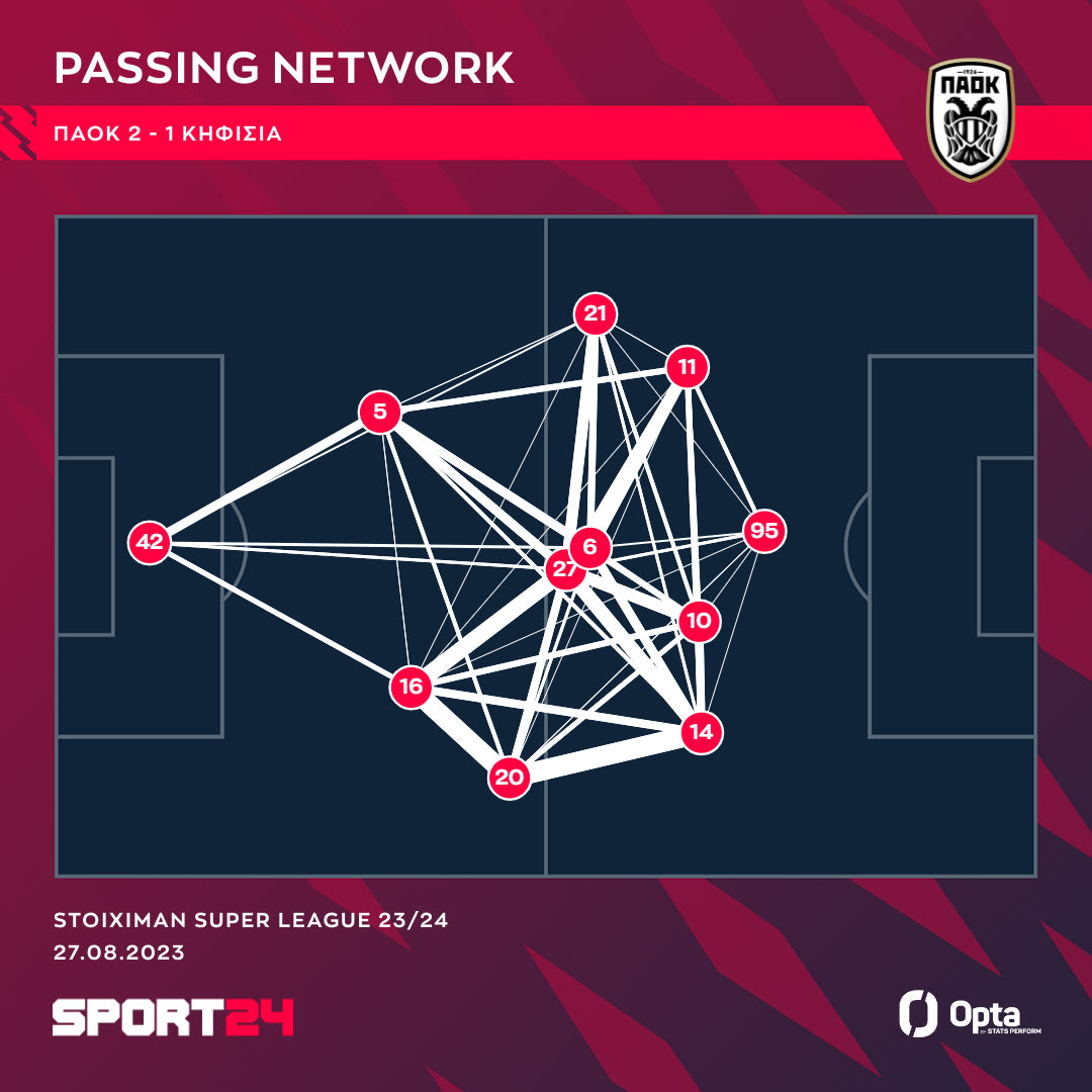 Ο 29χρονος στάθηκε ψηλά στον αγωνιστικό χώρο (19), όπως βλεπουμε στο δίκτυο των μεταβιβάσεων του Δικεφάλου, πιο μπροστά και από τους μέσους Τσιγγάρα (6) και Οζντόεφ (27). Ο Βιεϊρίνια που αγωνιζόταν στην αντίθετη πλευρά έμεινε κάτω από τη σέντρα, θέλοντας να είναι συνεπής στα μετόπισθεν.