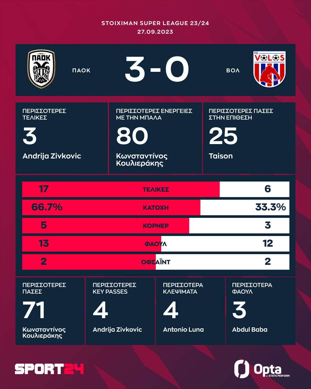 Ο ΠΑΟΚ με τρεις διαφορετικούς σκόρερ επικράτησε του Βόλου με 3-0, πρόσθεσε ένα ακόμη τρίποντο στη βαθμολογική του συγκομιδή, και παραμένει μόνος δεύτερος στη βαθμολογία της Super League. Έξι παιχνίδια χωρίς νίκη για την ομάδα της Μαγνησίας.