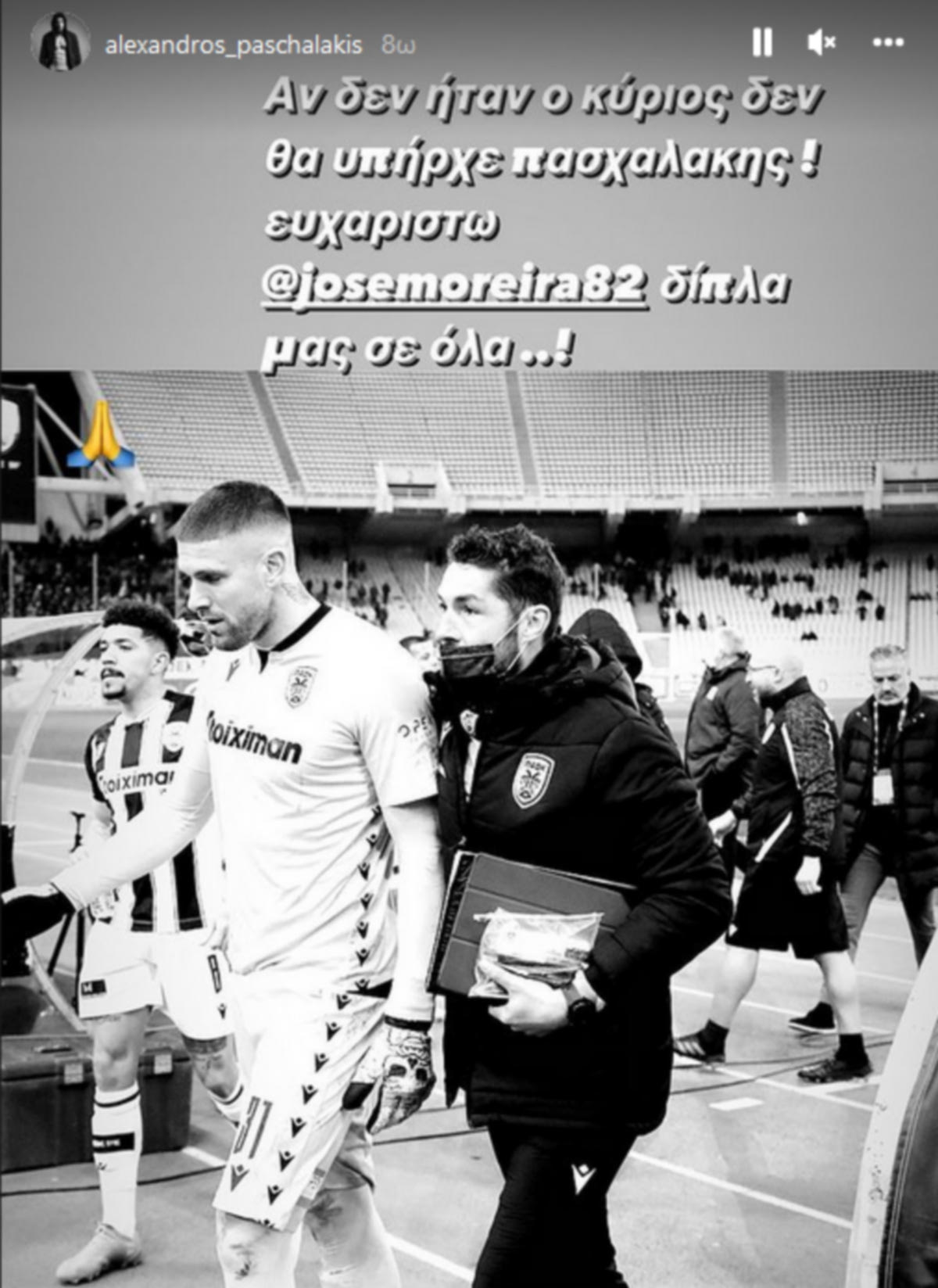 Ο γκολκίπερ του ΠΑΟΚ μάλιστα με ανάρτηση του στο Instagram απέδωσε τα εύσημα στον προπονητή τερματοφυλάκων του ΠΑΟΚ Ζοσέ Μορέιρα. “Αν δεν ήταν ο κύριος, δεν θα υπήρχε Πασχαλάκης. Ευχαριστώ Ζοσέ Μορέιρα. Δίπλα μας σε όλα“, έγραψε.