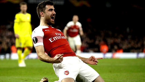 Arsenal's Sokratis Papastathopoulos celebrates after scoring his side's third goal during the Europa League round of 32 second leg soccer match between Arsenal and Bate at the Emirates stadium in London, Thursday, Feb. 21, 2019. (AP Photo/Matt Dunham) AP