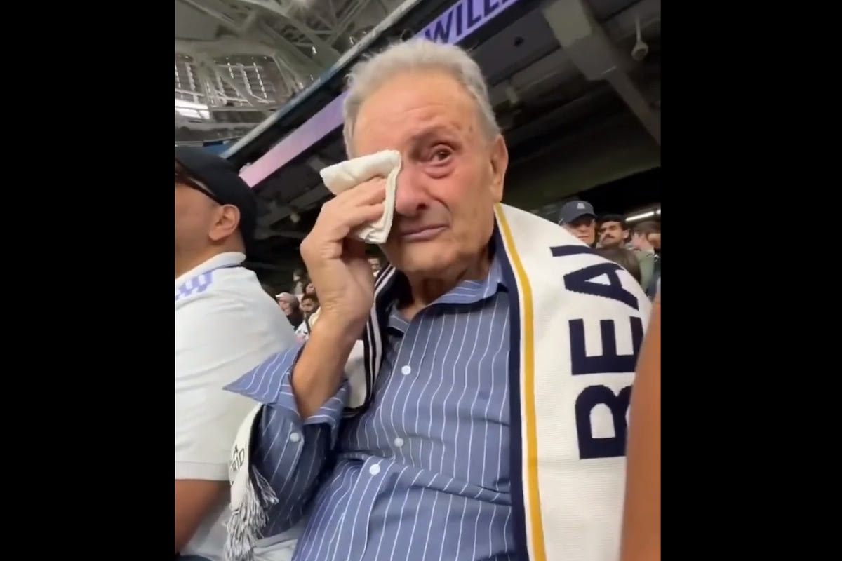 Εξαιρετικά συγκινημένος κι ενθουσιασμένος μπροστά στη θέα του επιβλητικού Μπερναμπέου, ο ηλικιωμένος άντρας δεν μπόρεσε να συγκρατήσει τα δάκρυά του.