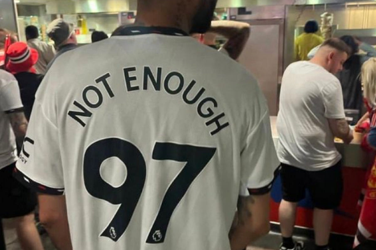 Ο οπαδός της Μάντσεστερ Γιουνάιτεντ εμφανίστηκε στον τελικό Κυπέλλου Αγγλίας κόντρα στη Σίτι φορώντας μία φανέλα με τη φράση “Not Enough” στην πλάτη και το νούμερο 97.