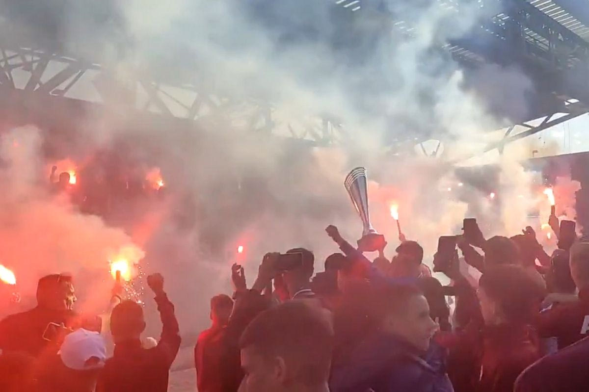 Εντυπωσιακές εικόνες από την κάμερα του SPORT24 με το ξέφρενο πάρτι του κόσμου και των παικτών της ΑΕΛ με το τρόπαιο.