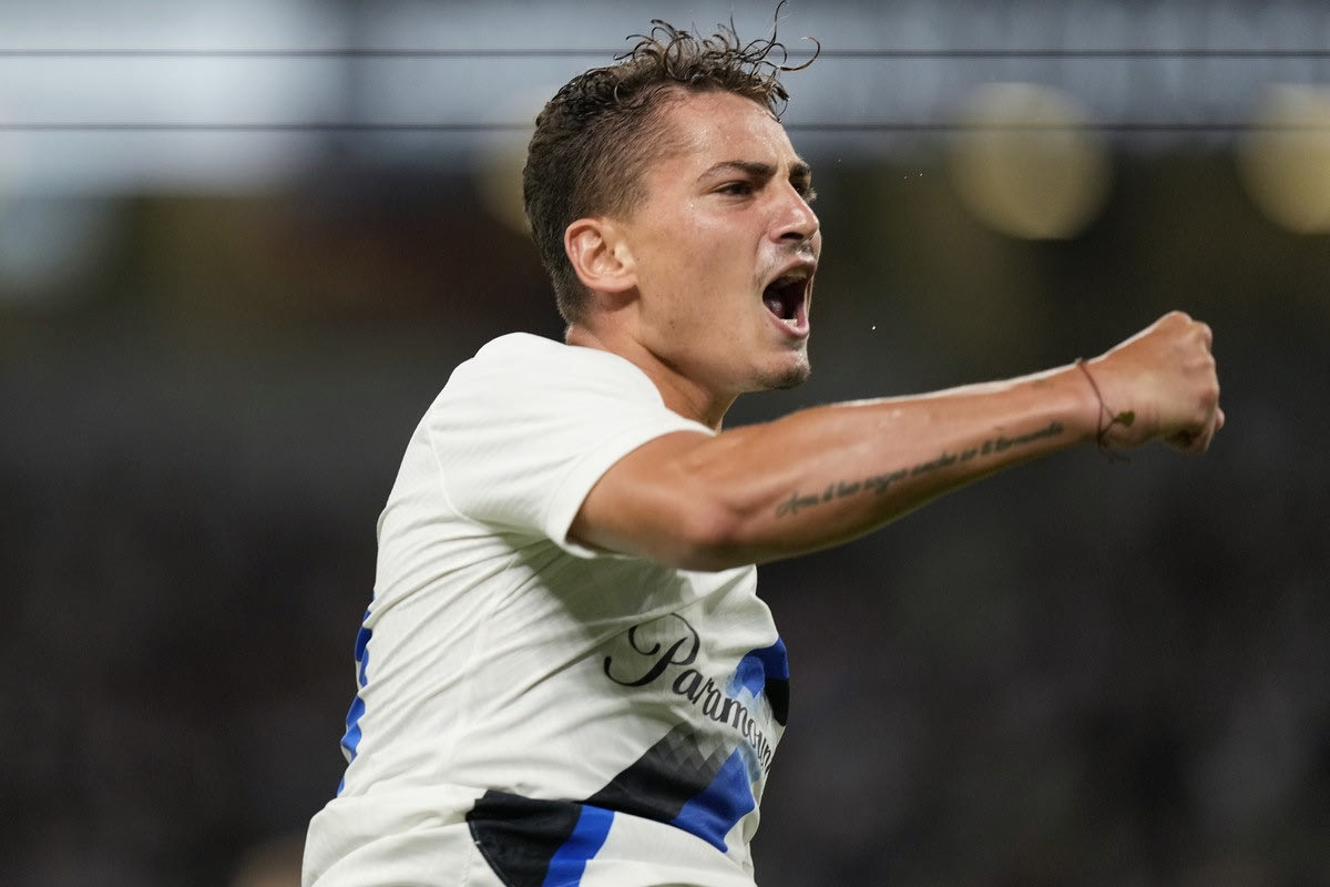 Inter Milan's Sebastiano Esposito reacts after scoring a point against PSG during the second half of a friendly soccer match in Tokyo, Tuesday, Aug. 1, 2023. (AP Photo/Hiro Komae)