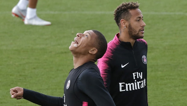 PSG's Kylian Mbappe , left, trains with Neymar during a training session at the club training center in Saint Germain en Laye, west of Paris, Friday, Aug.24, 2018. Paris Saint Germain will play Angers Saturday in a French League One match. (AP Photo/Michel Euler)
