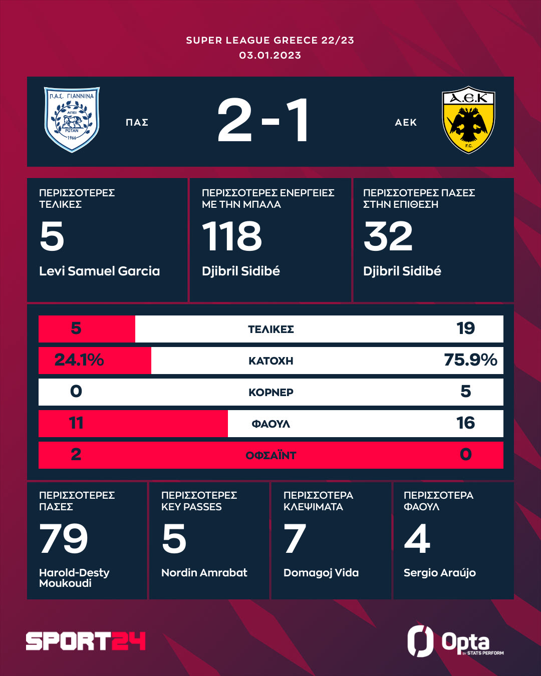 ΑΕΚ: Αθανασιάδης, Σιντιμπέ, Βίντα, Μουκουντί, Χατζησαφί, Γιόνσον, Φερνάντες (65′ Φαν Βερτ), Πινέδα (73′ Τσούμπερ), Άμραμπατ, Γκαρσία, Αραούχο.