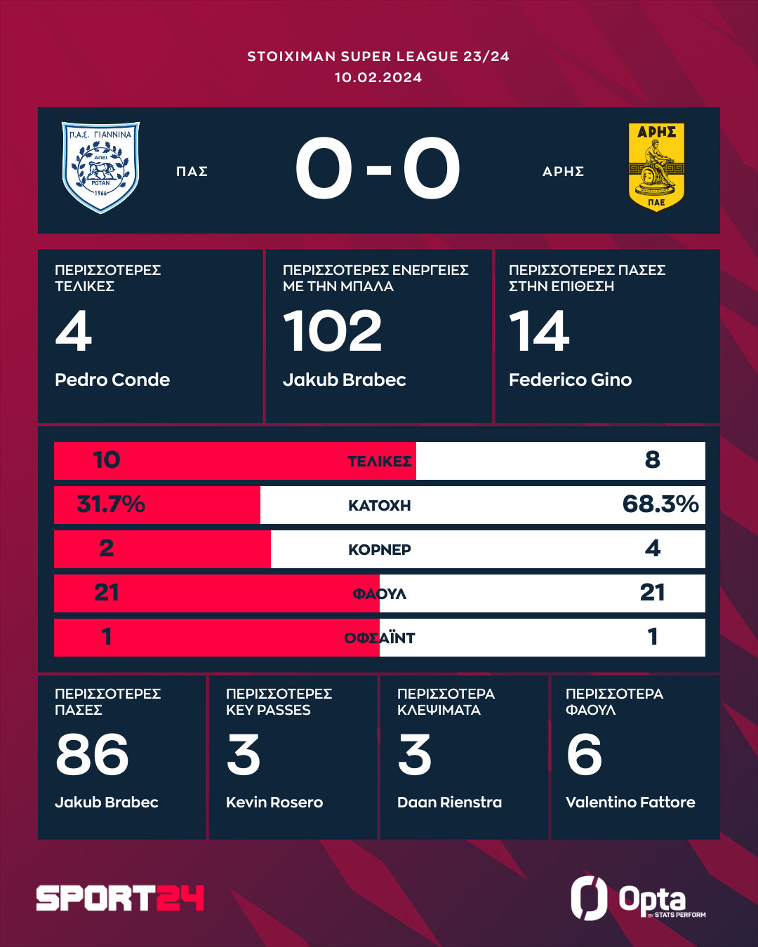 Ο ΠΑΣ Γιάννινα στάθηκε αρκετά καλά, ο Άρης ανέβασε στροφές μετά το 60', όμως κανείς τους δεν μπόρεσε να σκοράρει με τις δύο ομάδες να μένουν στο μηδέν, ένα αποτέλεσμα που δεν άρεσε σε κανέναν.