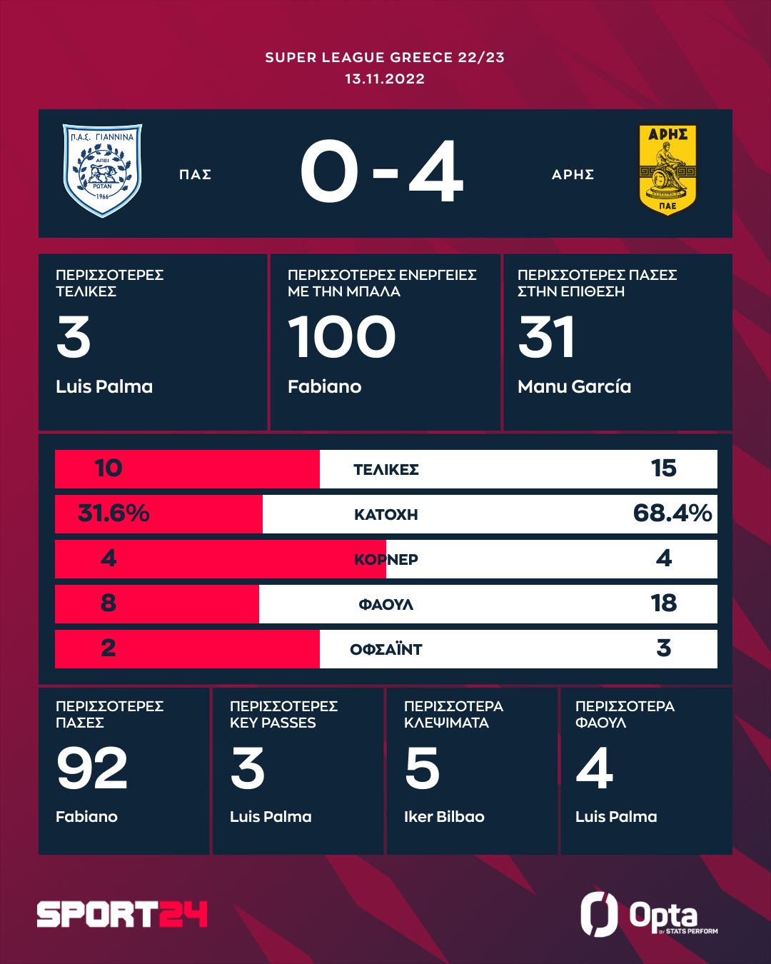 Με νίκη έκλεισε ο Άρης τον πρώτο γύρο της Super League, καθώς επικράτησε του ΠΑΣ Γιάννινα 4-0 στους Ζωσιμάδες. Ο Φαμπιάνο με εύστοχο χτύπημα πέναλτι στο 60′ άνοιξε το σκορ, ο Ενκολού με κεφαλιά έκανε το 2-0 στο 78′ και το τέρμα του Οντουμπάτζο στο 81′, με τον Πάλμα να διαμορφώνει το τελικό σκορ στο 90+3′.
