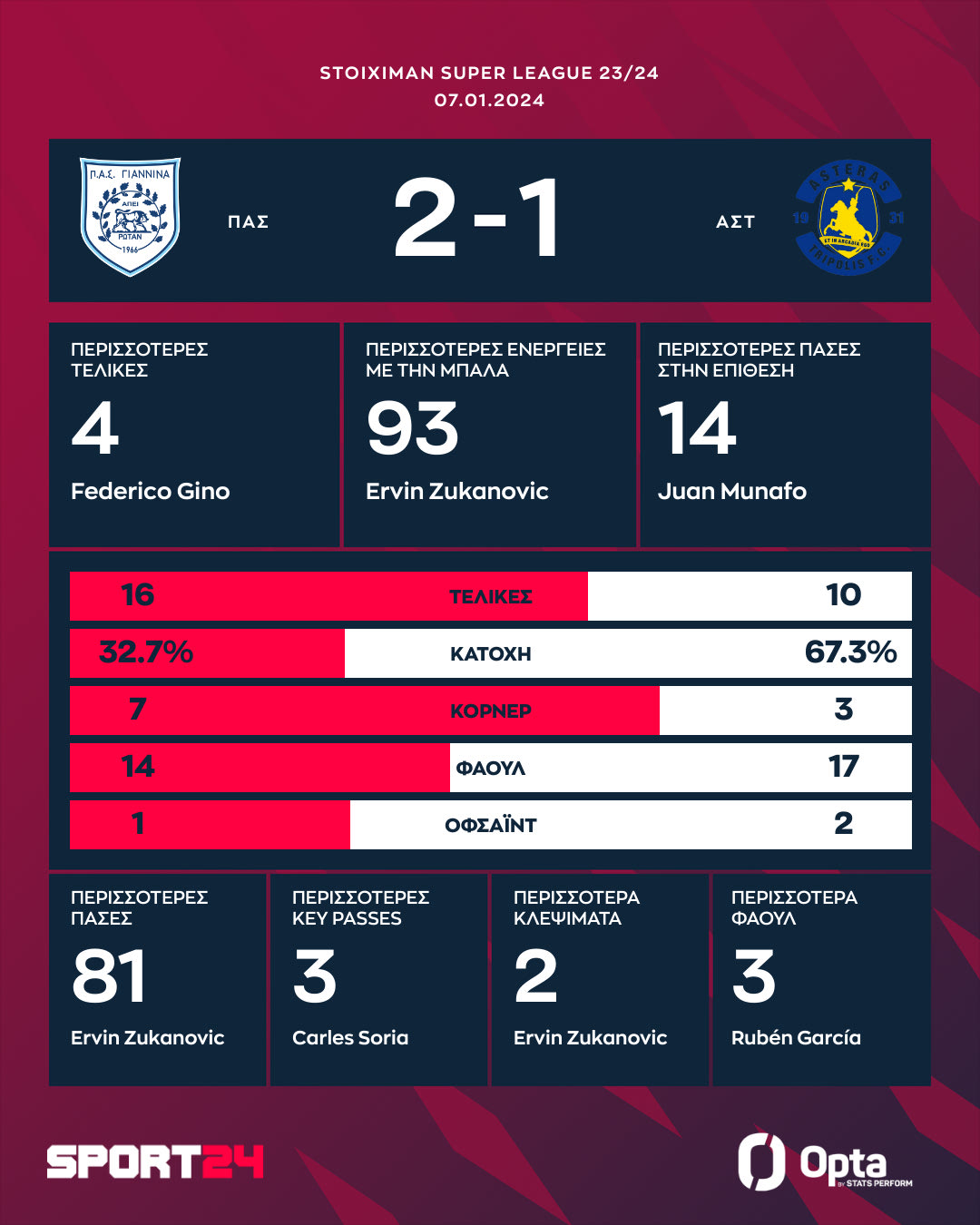 Στο 90+1′ η κεφαλιά του Μάντζη μέσα από την περιοχή έφυγε άουτ και λίγο αργότερα το τελευταίο σφύριγμα του διαιτητή βρήκε τους ποδοσφαιριστές του ΠΑΣ Γιάννινα να πανηγυρίζουν μία σπουδαία νίκη.