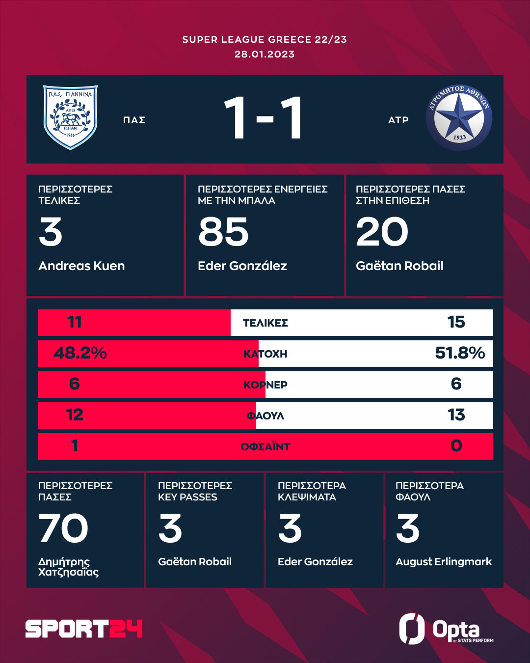 Ο Ατρόμητος έφυγε με τον βαθμό από τα Ιωάννινα, καθώς ο Τζοβάρας "απάντησε" στο γκολ που πέτυχε ο Μπάλαν στο πρώτο μέρος, ενώ ο Γιαννιώτης έπιασε το πέναλτι του Νίνη στις καθυστερήσεις και οι δύο ομάδες αναδείχθηκαν ισόπαλες 1-1.