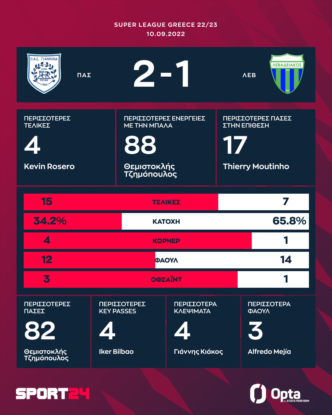 Ο ΠΑΣ Γιάννινα πέτυχε την πρώτη του νίκη στη Super League, επικρατώντας του Λεβαδειακού 2-1 στους Ζωσιμάδες. Ο Ροσέρο έκανε το 1-0 στο 2′, ο Μουτίνιο ισοφάρισε προσωρινά με ένα έξυπνο σουτ στο 45+2′ και ο Εραμούσπε διαμόρφωσε το τελικό σκορ στο 73′. Η ομάδα των Ιωαννίνων έφτασε τους τέσσερις βαθμούς στο πρωτάθλημα, ενώ ο Λεβαδειακός παρέμεινε στον ένα βαθμό.
