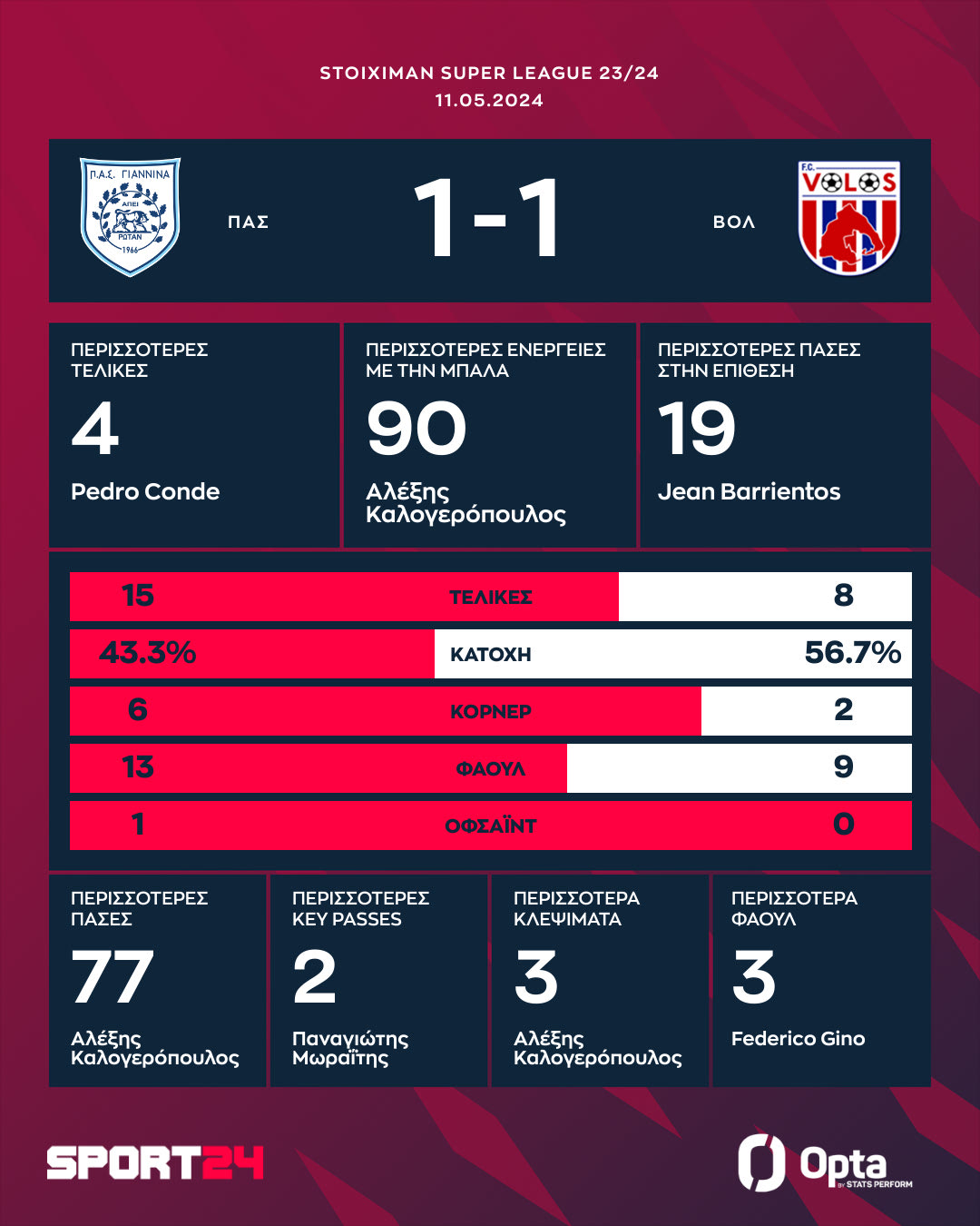 Ο ΠΑΣ Γιάνιννα είπε αντίο στα σαλόνια του ελληνικού ποδοσφαίρου με ένα ισόπαλο αποτέλεσμα με τον Βόλο στους Ζωσιμάδες. Οι Ηπειρώτες πήραν κεφάλι στο σκορ με τον Τζίμα στο 55ο λεπτό, αλλά ο Μωραΐτης του στέρησε το τρίποντο στο φινάλε με κεφαλιά στο 89ο λεπτό.