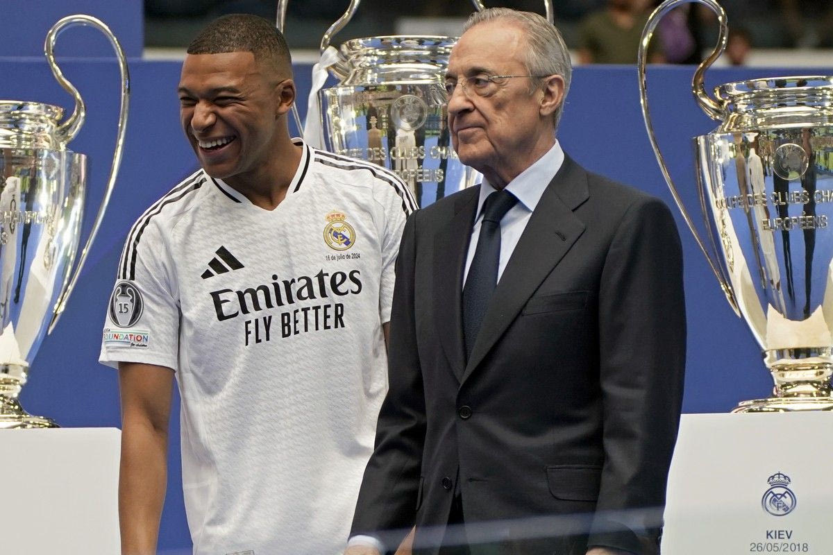 Kylian Mbappe, of France, smiles next to Real Madrid President Florentino Perez while being presented to fans as a new Real Madrid player at the Santiago Bernabeu stadium in Madrid, Tuesday, July 16, 2024. (AP Photo/Andrea Comas) @2024 Andrea Comas/AP IMAGES