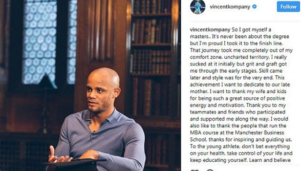 Την τελευταία τετραετία ο Βινσέντ Κομπανί, παράλληλα με τις αγωνιστικές του υποχρεώσεις, σπούδαζε διοίκηση επιχειρήσεων στο Μάντσεστερ. Οι κόποι του ανταμείφθηκαν και όπως ο ίδιος αποκάλυψε μέσα από τον λογαριασμό του στο instagram, ολοκλήρωσε το Master στο “Manchester Business School”.