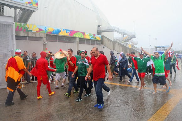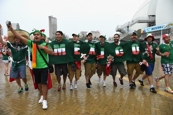NATAL, BRAZIL - JUNE 13: A group of Mexico fans cheer in the rain before the 2014 FIFA World Cup Brazil Group A match between Mexico and Cameroon at Estadio das Dunas on June 13, 2014 in Natal, Brazil. (Photo by Matthias Hangst/Getty Images) Getty Images