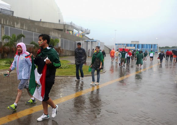 NATAL, BRAZIL - JUNE 13: Fans brave the rain before the 2014 FIFA World Cup Brazil Group A match between Mexico and Cameroon at Estadio das Dunas on June 13, 2014 in Natal, Brazil. (Photo by Miguel Tovar/Getty Images) Getty Images