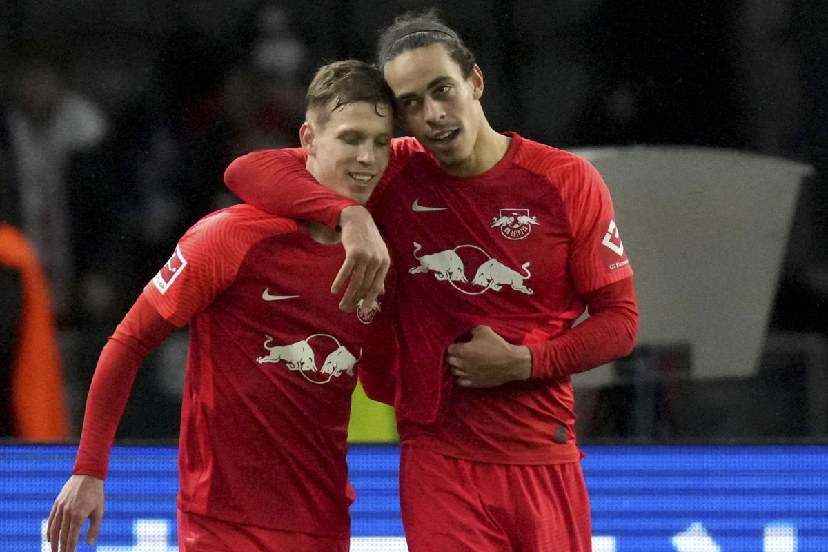Οι άσοι της Λειψίας, Ντάνι Όλμο και Γιουσούφ Πόουλσεν πανηγυρίζουν το έκτο γκολ κόντρα στη Χέρτα Ⓒ 2022 MICHAEL SOHN/ASSOCIATED PRESS