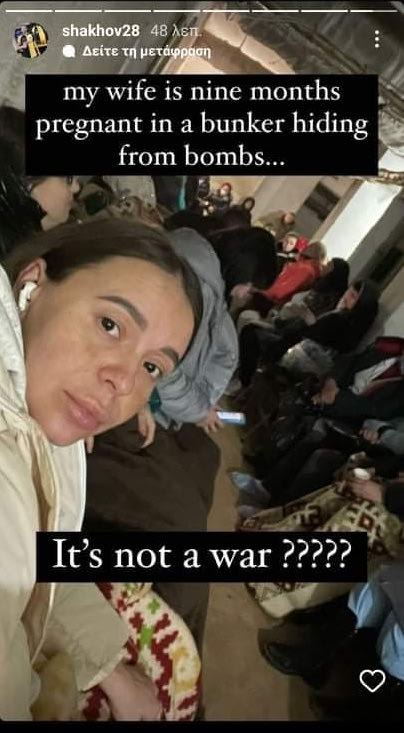 Ο Εβγέν Σάκχοφ έκανε μια ανάρτηση στο Instagram στην οποία δείχνει μια φωτογραφία με τη σύζυγό του μέσα στα καταφύγια, όπου έχει κρυφτεί για να γλιτώσει τους βομβαρδισμούς, αναρωτώμενος αν δεν είναι πόλεμος αυτό που συμβαίνει στην Ουκρανία, εκφράζοντας και αυτός την αγωνία του για τη σύζυγό του και τους συμπατριώτες του.