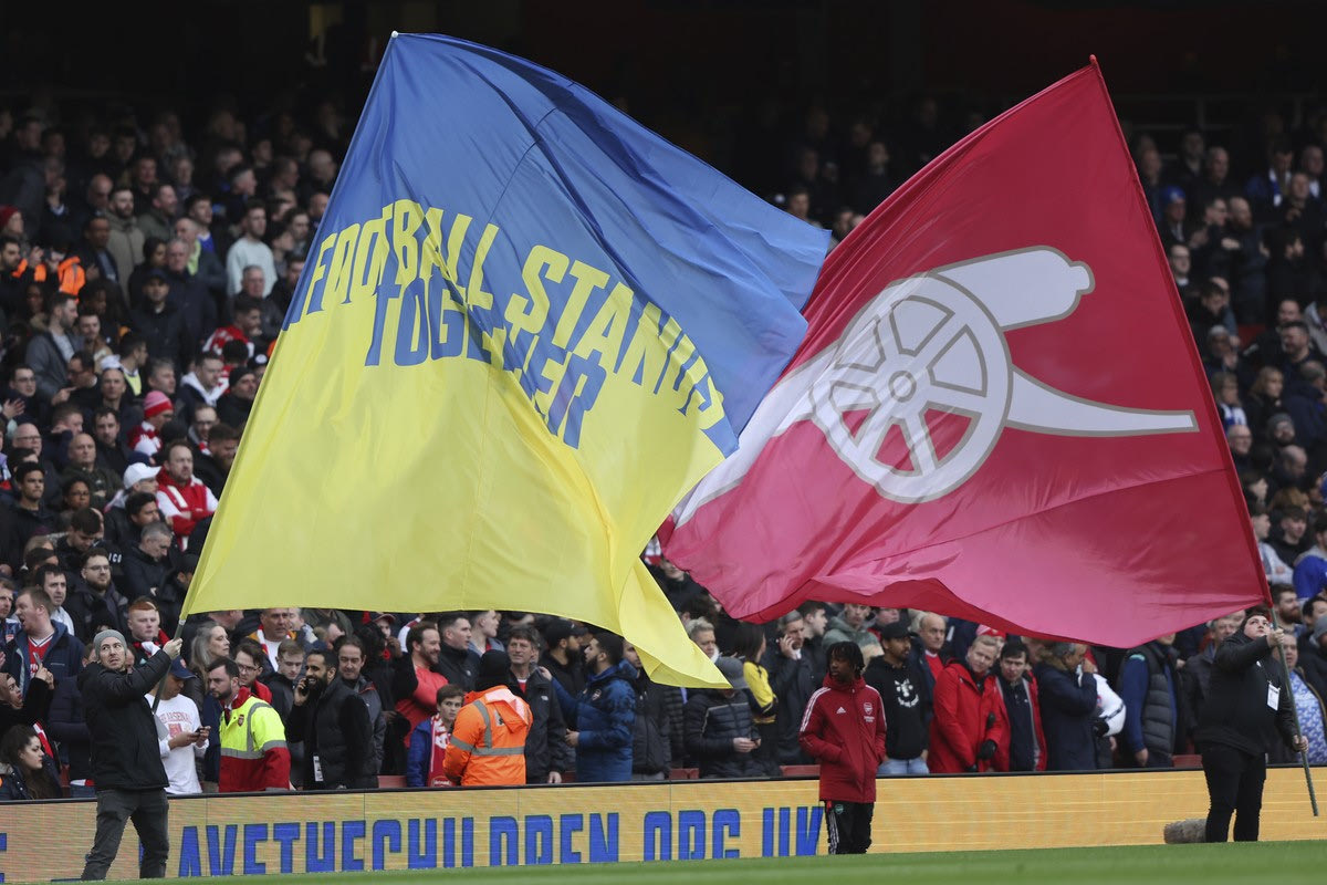 Οπαδοί της Άρσεναλ ανεμίζουν σημαία της Ουκρανίας πριν από την έναρξη του αγώνα της ομάδας τους με την Λέστερ | 13 Μαρτίου 2022 @2022 Ian Walton/AP IMAGES