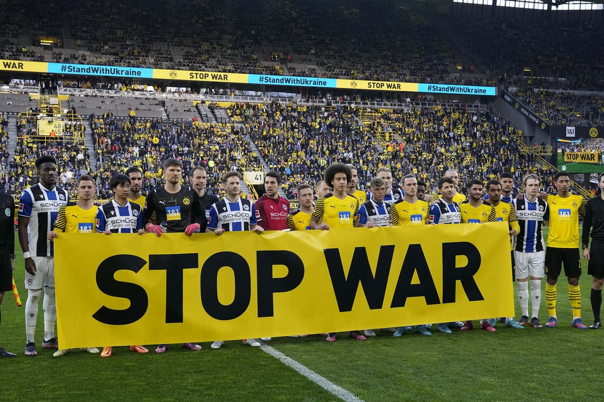 Οι παίκτες των Ντόρτμουντ και Αρμίνια κρατούν πανό με μήνυμα κατά του πολέμου στην Ουκρανία | 13 Μαρτίου 2022 @2022 Martin Meissner/AP IMAGES