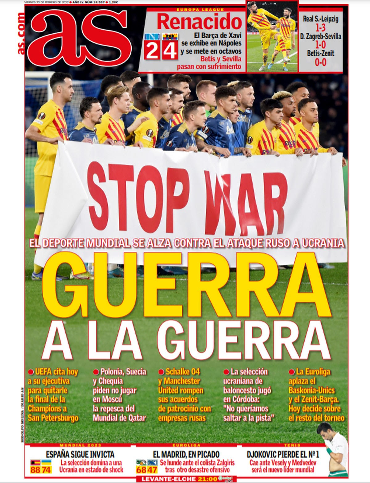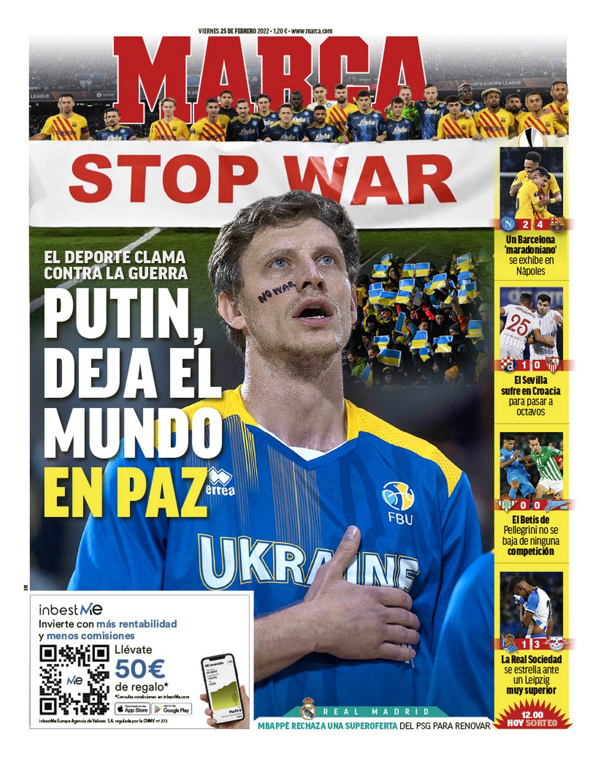 “Πούτιν άφησε τον κόσμο σε ειρήνη”, ήταν το μήνυμα της μαδριλένικης “Marca”, με την έτερη μεγάλη σε κυκλοφορία αθλητική εφημερίδα της ισπανικής πρωτεύουσας να έχει τον εξής τίτλο: “Πόλεμο στον πόλεμο”, με αμφότερες να έχουν σε πρώτο πλάνο τους παίκτες των Νάπολι και Μπαρτσελόνα να κρατούν μαζί πανό που έγραφε “Όχι στον πόλεμο”.