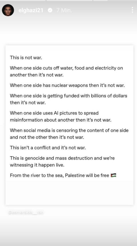 Δεν είναι διαμάχη και δεν είναι πόλεμος. Αυτό είναι γενοκτονία και μαζική καταστροφή και μαρτυρούμε να συμβαίνουν ζωντανά. Από τον ποταμό μέχρι τη θάλασσα, η Παλαιστίνη θα ελευθερωθεί”, έγραψε ο Ελ Γκάζι.