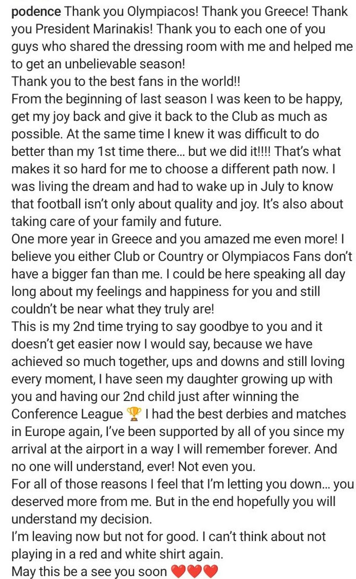 Ο Ποντένσε με ένα συγκινητικό του μήνυμα στο Instagram αποχαιρέτησε τον Ολυμπιακό, τον Βαγγέλη Μαρινάκη και τους φιλάθλους των ερυθρόλευκων.