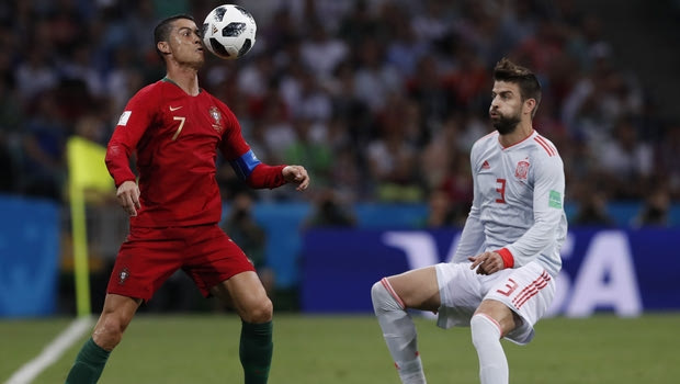 Portugal's Cristiano Ronaldo, left heads the ball as Spain's Gerard Pique closes during the group B match between Portugal and Spain at the 2018 soccer World Cup in the Fisht Stadium in Sochi, Russia, Friday, June 15, 2018. (AP Photo/Manu Fernandez)