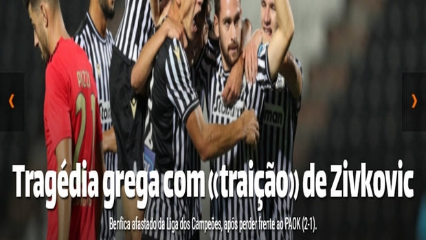 Το MaisFutebol έχει τίτλο “ελληνική τραγωδία” για τον αποκλεισμό της Μπενφίκα από τον ΠΑΟΚ στην Τούμπα (επί ελληνικού εδάφους) κάνοντας λόγο για “προδοσία Ζίβκοβιτς”, καθώς ο Σέρβος ανήκε μέχρι και πριν από ένα μήνα στους Λουζιτανούς, από τους οποίους έμεινε ελεύθερους για να έλθει στην Ελλάδα.