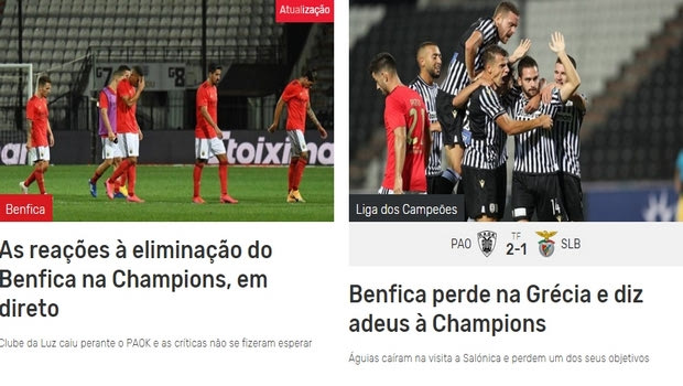 Η Record λέει αντίο στο Champions League είναι ο τίτλος με τον οποίον περιγράφει την είδηση της ήττας και του αποκλεισμού της Μπενφίκα από τον ΠΑΟΚ.