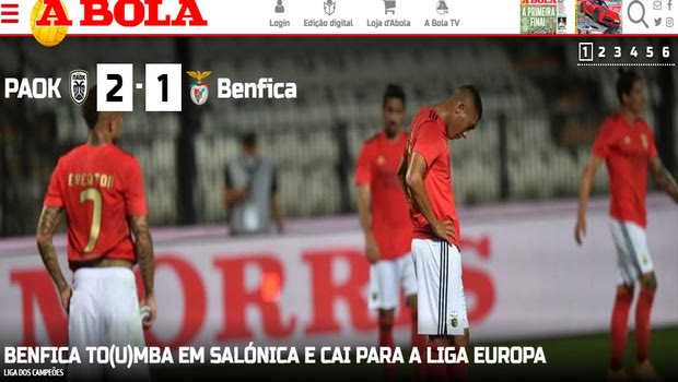 Ο πορτογαλικός Τύπος περιγράφει τον αποκλεισμό της Μπενφίκα από τον ΠΑΟΚ ως "ελληνική τραγωδία", κάνει λογοπαίγνιο με την Τούμπα και ιδιαίτερη αναφορά στον Άντριγια Ζίβκοβιτς.