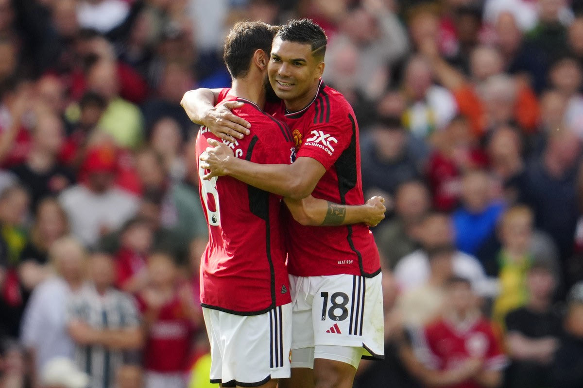 Ο Καζεμίρο πανηγυρίζει μαζί με τον Μπρούνο Φερνάντες γκολ της Μάντσεστερ Γιουνάιτεντ κόντρα στην Νότιγχαμ | 26 Αυγούστου 2023 @2023 Jon Super/AP IMAGES