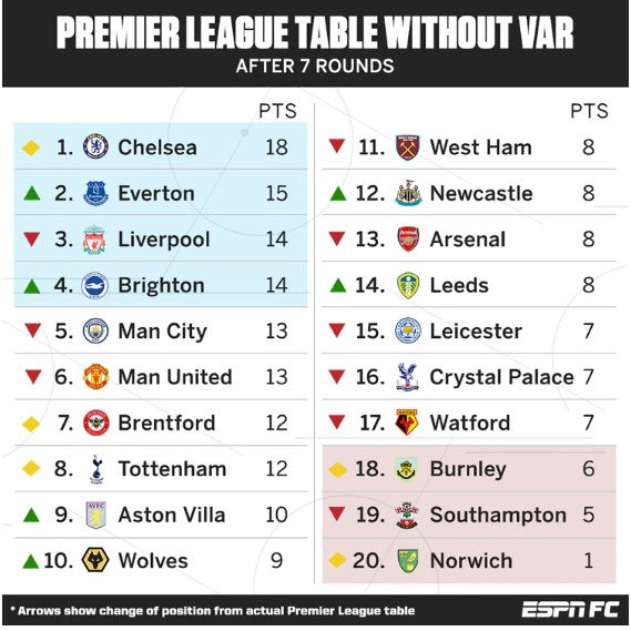 To Espn δημοσίευσε τη βαθμολογία που θα ίσχυε στην Premier League μετά τις πρώτες επτά αγωνιστικές αν δεν είχε παρέμβει το VAR και ανέδειξε νικητές και ηττημένους σε σύγκριση με την πραγματική βαθμολογία.